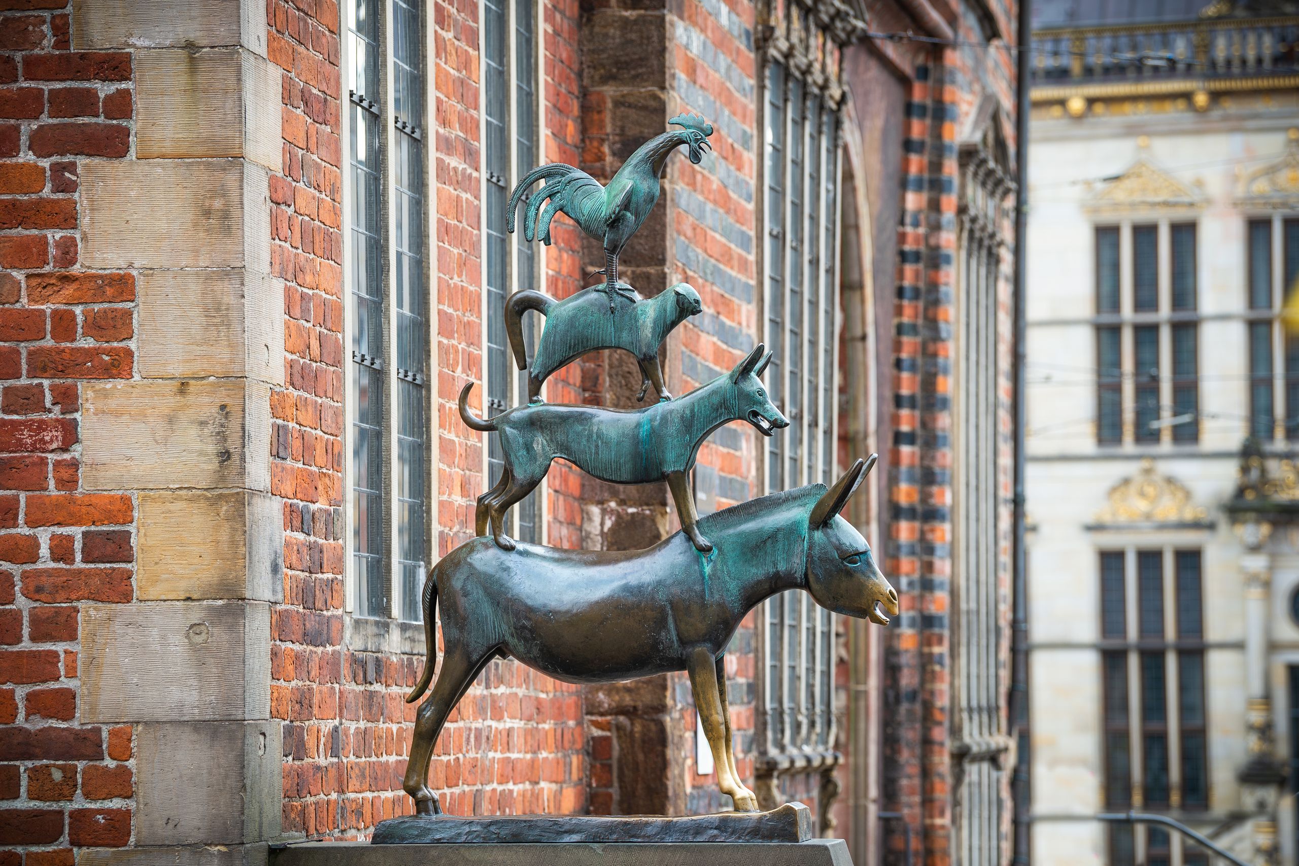 Am Fuße des Bremer Rathauses haben sie ihren Platz gefunden: die Bremer Stadtmusikanten. Im Jahre 1951 wurde die kleine, aber nicht weniger feine Statue des deutschen Bildhauers Gerhard Marcks im Herzen der Bremer Innenstadt aufgestellt und erfreut bis heute täglich zahlreiche Besucherinnen und Besucher. Ein Foto mit den vier gestapelten Tieren aus dem berühmten Märchen der Brüder Grimm darf bei einem Besuch der Hansestadt auf keinen Fall fehlen. Außerdem besagt ein weitverbreiteter Glaube, dass es Glück bringt, die beiden Vorderbeine des Esels zu umfassen. Kein Wunder also, dass die Fesseln des Langohrs blank poliert funkeln.