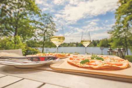 Das Café Fegetasche in Plön bietet stilvolles Ambiente, atemberaubende Seesicht, hauseigene Patisserie und Spielplatz mit Seeblick.