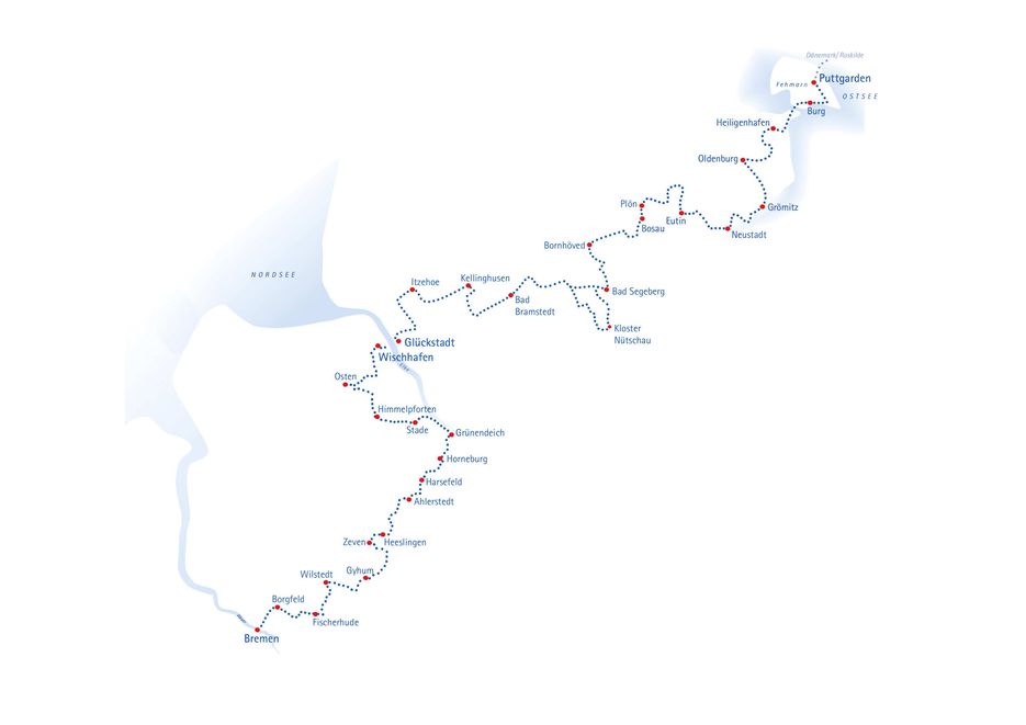 Für uns verläuft die Route immer von West nach Ost, beginnt also in Bremen und endet in Puttgarden auf der Ostseeinsel Fehmarn. Warum? Weil die Christianisierung sich in diesem Verlauf vollzogen hat. Aber natürlich können Sie die beschilderte Strecke in beide Richtungen fahren.