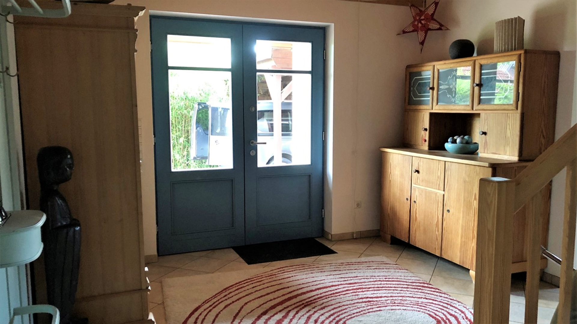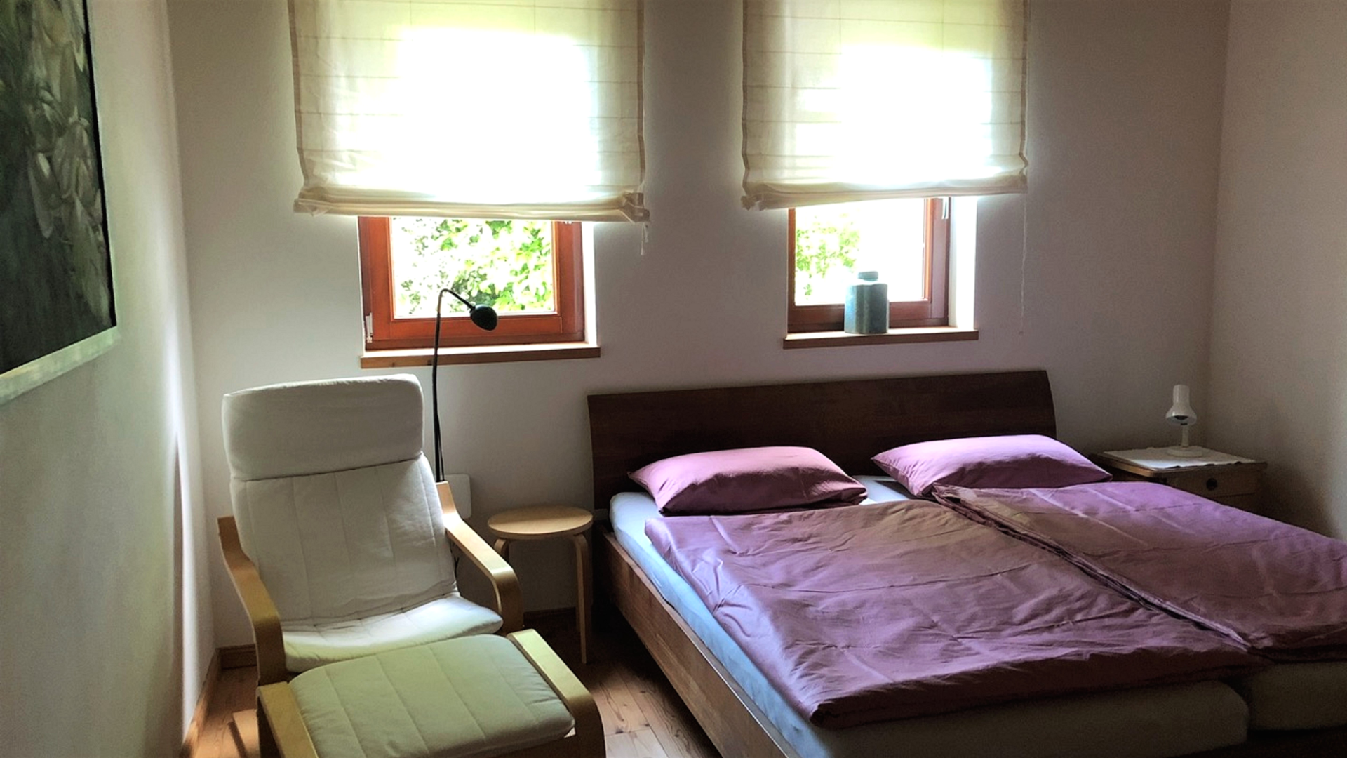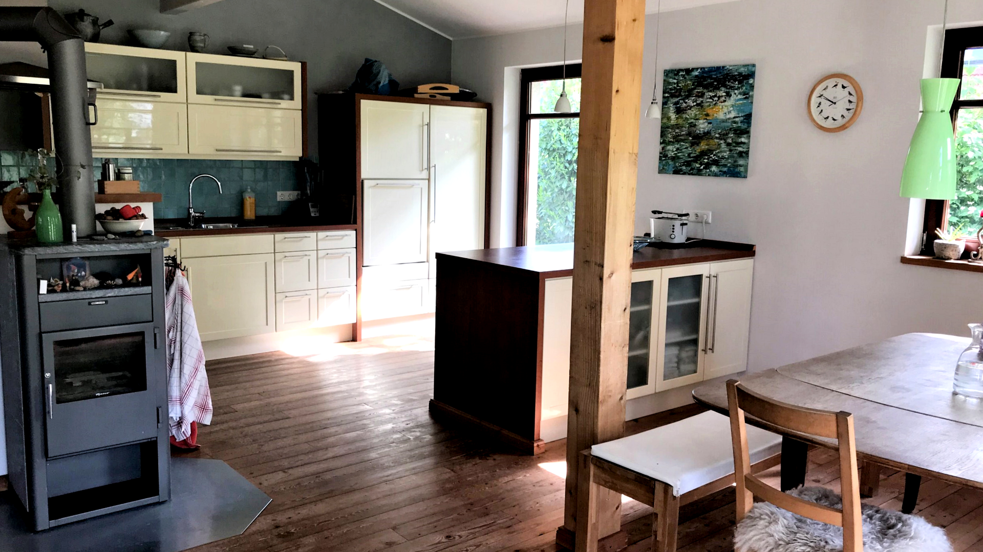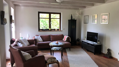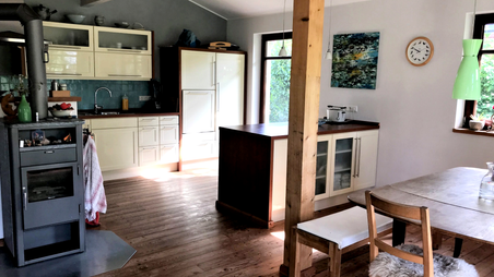 Die Ausstattung mit natürlichen Baumaterialien sorgt für behaglichen Wohnkomfort. Umgeben ist das Haus von einem schönen Garten inklusive zwei Freisitzen.