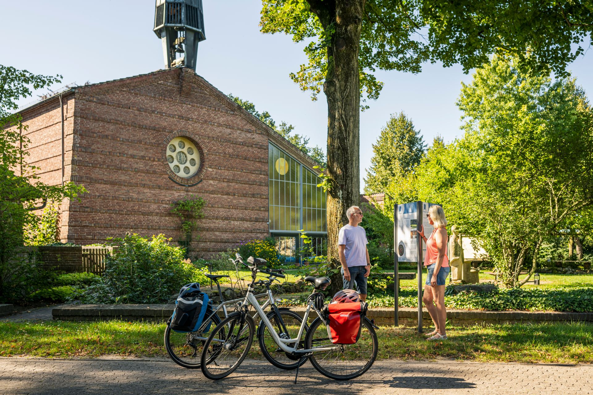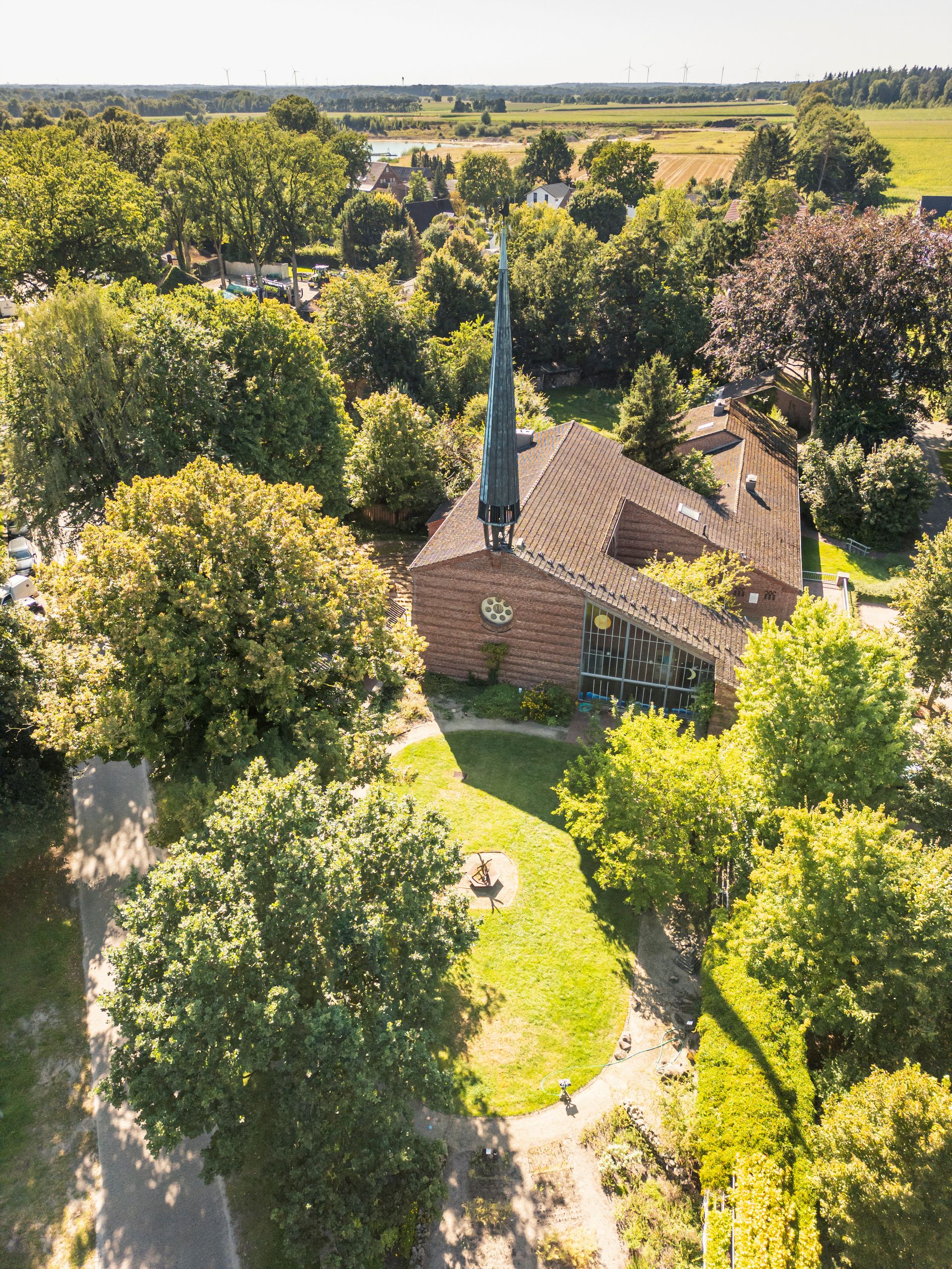 Mit viel Fantasie hat er ein Kirchengebäude geschaffen, das zum Verweilen einlädt. Der rote Backsteinbau fügt sich gut in die dörfliche Struktur ein. Interessant ist die Kirche auch durch ihre Symbolik. Gildemeister arbeitete mit Kreisformen, Kreuzen und Quadraten und er fügte eine spannende Zahlensymbolik ein. Ein kleiner Rundgang durch diese besondere Kirche lohnt sich, nehmen Sie sich Zeit und lassen Sie den fein gegliederten und in jedem Detail durchdachten Raum auf sich wirken. Außen befindet sich ein Bibel- und Labyrinthgarten, der zum Spazierengehen und Verweilen einlädt,