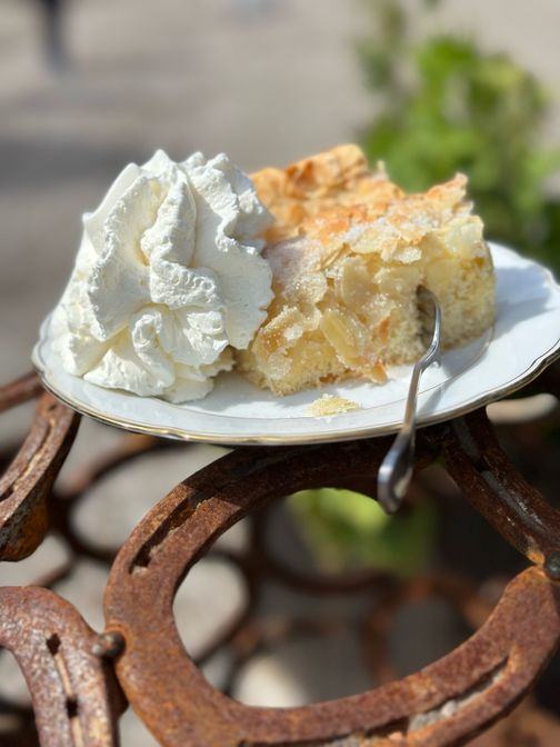 Der Butterkuchen besteht aus saftigem Hefeteig mit Mandeln und einer Zuckerkruste, die beim Backen leicht karamellisiert.