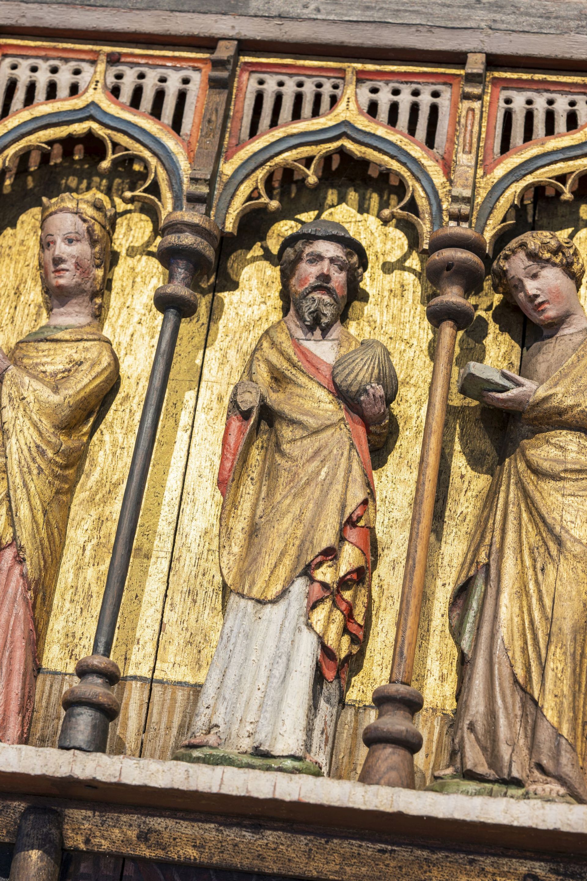 Ein kleines Detail am Hauptschrein des Altars zieht die Besucher des Mönchsweges besonders an: Da steht der heilige Jakobus mit der Jakobsmuschel in der linken Hand. Der Legende nach soll er am Tag seiner eigenen Bestattung als Leichnam einen jungen Adligen aus dem Meer gerettet haben. Da dieser dann, aus dem Wasser gezogen, über und über mit Muscheln bedeckt war, wird Jacobus häufig mit einer Muschel dargestellt. Zu seinem Grab in Santiago de Compostela pilgern seit dem Mittelalter auf dem heute berühmten Jakobsweg Tausende von Gläubigen, weshalb die Muschel auch zum Erkennungszeichen der Pilger wurde.