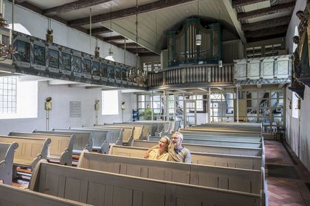 Die gotische Backsteinsaalkirche wurde um 1260 auf Granitsteinfundamenten errichtet. Früher waren hier auf einem Landweg Wikinger, Pilger, Ochsentreiber, Soldaten, Könige und Bettler unterwegs. Die Kirche diente ihnen bei Wind und Wetter als Zufluchtsort. Reisende, die Schutz suchten, beteten hier für eine sichere Heimkehr. Schauen Sie sich die Kirche von innen an in unserer Bildergalerie. Der ursprüngliche Bau des längsrechteckigen, flach gedeckten Backsteinsaales mit geradem Chorschluss wurde durch Umbauten und Erweiterungen im Laufe der Jahrhunderte stark verändert. Bei der letzten Renovierung 1989 legten die Bad Bramstedter die Holzbalkendecke und die Emporenbilder aus dem 17. Jahrhundert wieder frei. Für das Pflaster im Eingangsbereich verwendeten sie historische Platten, die unter mehreren Fußbodenschichten im Kirchenschiff gefunden worden waren.