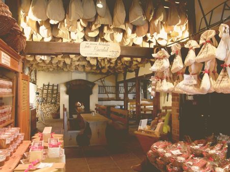 Die Schlachterei und Schinkenräucherei Petersen & Söhne ist ein historisches Juwel in Malente, das seit über 200 Jahren besteht. In der charakteristischen Räucherkate auf der Bahnhofstraße wird eine Vielzahl von Holsteiner Fleisch- und Wurstwaren angeboten, die nach traditionellen Rezepten gewürzt und geräuchert werden. Der sogenannte "Schinkenhimmel" ist ein besonderes Highlight, unter dem Besucher eine rustikale Mahlzeit vor dem Kamin genießen können. Neben Fleisch- und Wurstwaren bietet das Geschäft eine Vielzahl von hausgemachten Salaten, Aufschnitten und regionalen Spezialitäten wie Eierlikör und selbstgebackenes Bauernbrot. Bei gutem Wetter können die Köstlichkeiten im Freien genossen werden, wo Tische und Stühle vor der Schlachterei und Schinkenräucherei Petersen & Söhne bereitstehen. Ein weiteres Highlight sind die regelmäßig stattfindenden Kunsthandwerkermärkte, die in der stimmungsvollen Atmosphäre der Kate abgehalten werden. Die Räucherei selbst befindet sich in einer historischen Räucherkate aus dem Jahr 1788 in Timmdorf, wo der Holsteiner Katenschinken und die Katenrauchmettwürste noch auf traditionelle Weise geräuchert werden. Ein Besuch bei Petersen & Söhne ist ein authentisches Erlebnis, das einen Einblick in die regionale Handwerkskunst und Gastronomie bietet.