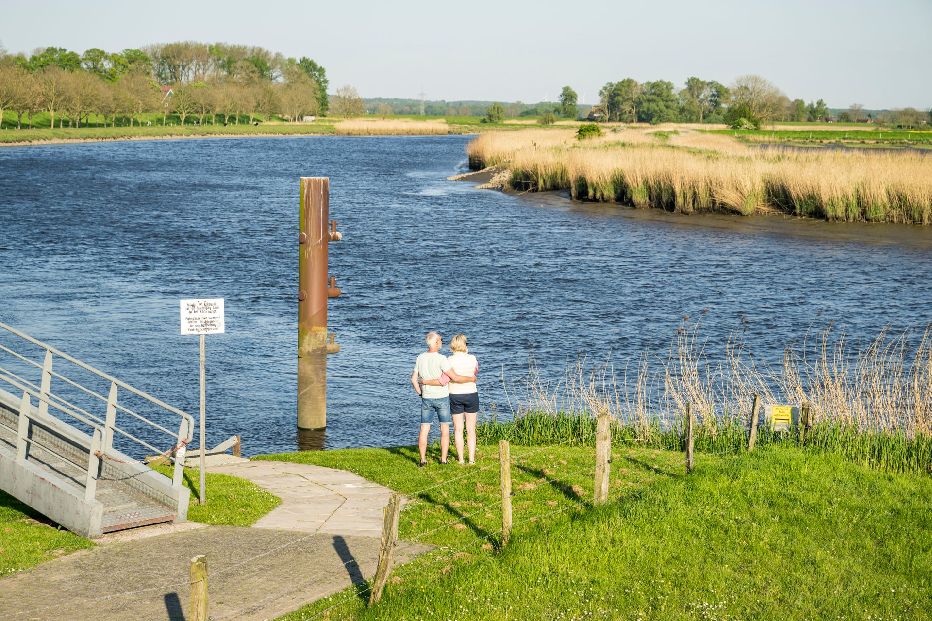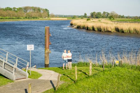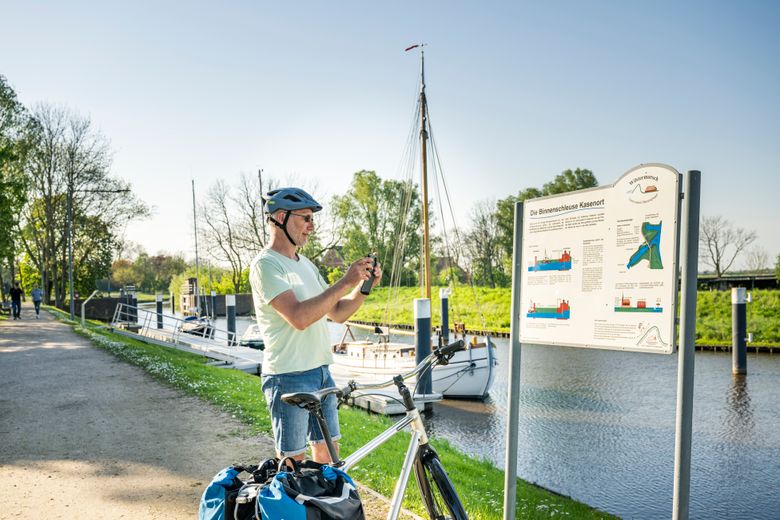 Die Schleuse Kasenort, ein technisches Meisterwerk an der Mündung der Wilster-Au in die Stör, schützt das Marschland vor Überschwemmungen und ermöglicht Schiffsverkehr. Ein Café lädt zur Rast ein.