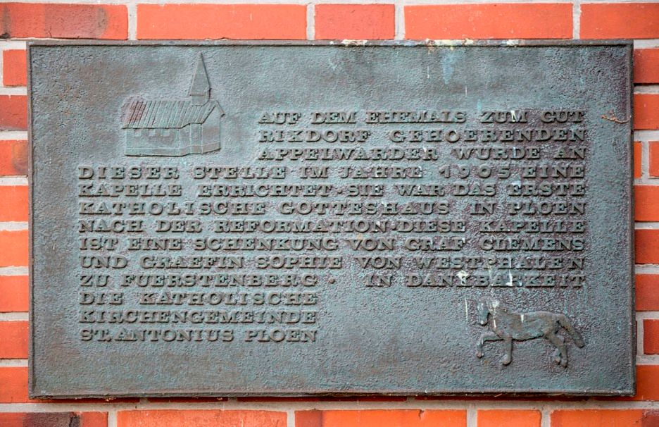 Clemens Graf von Westphalen auf Rixdorf gab im Jahre 1903 auf einem Gut in der Nähe von Plön anlässlich einer Pferdewette ein bedeutendes Versprechen. Er würde eine kleine Kapelle am Stadtrand von Plön bauen, wenn sein Pferd bei einem Rennen in Prag gewinnen würde (was sehr unwahrscheinlich schien). Aber dieses Pferd gewann und der Graf hielt sein Versprechen.
