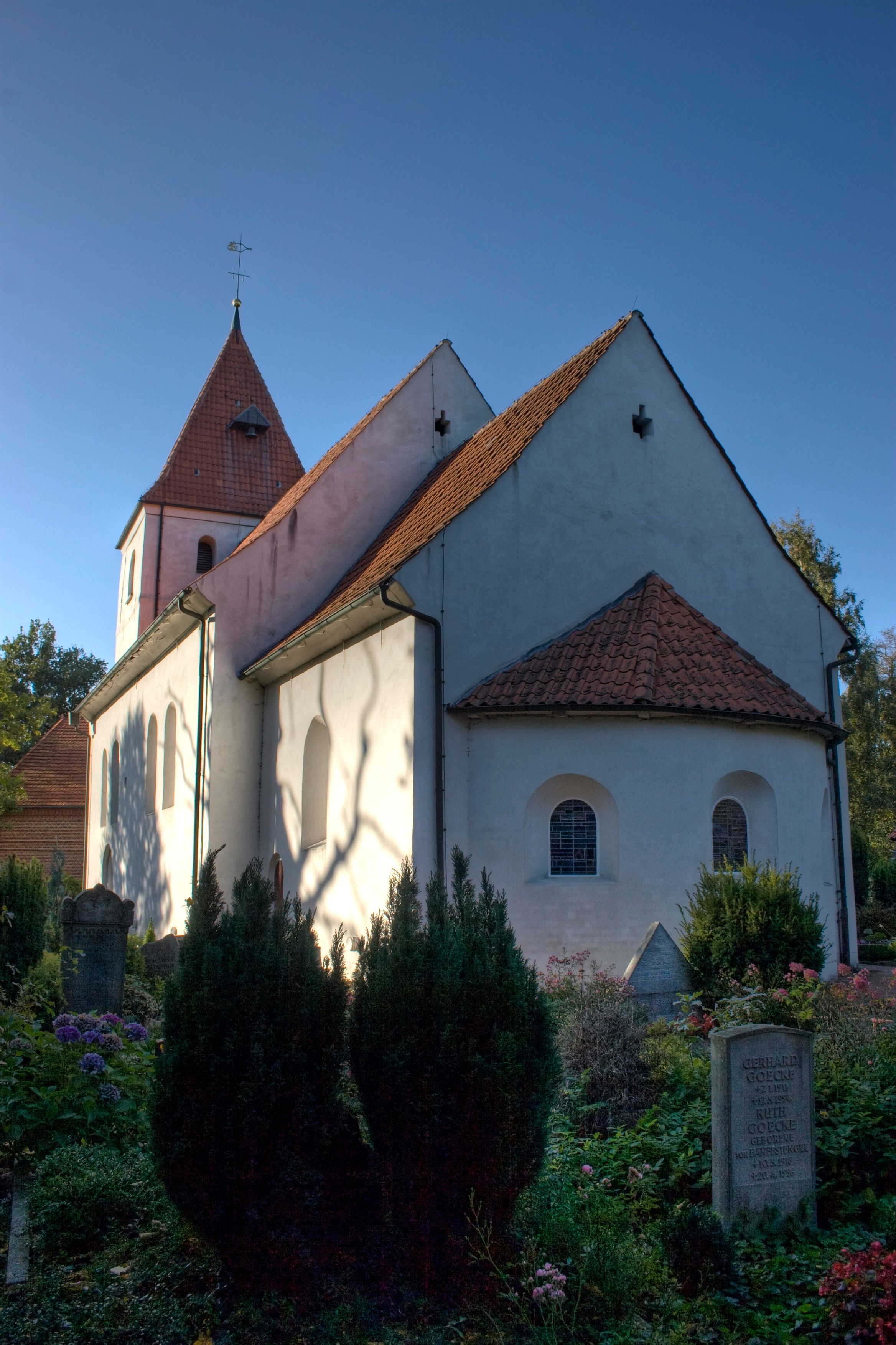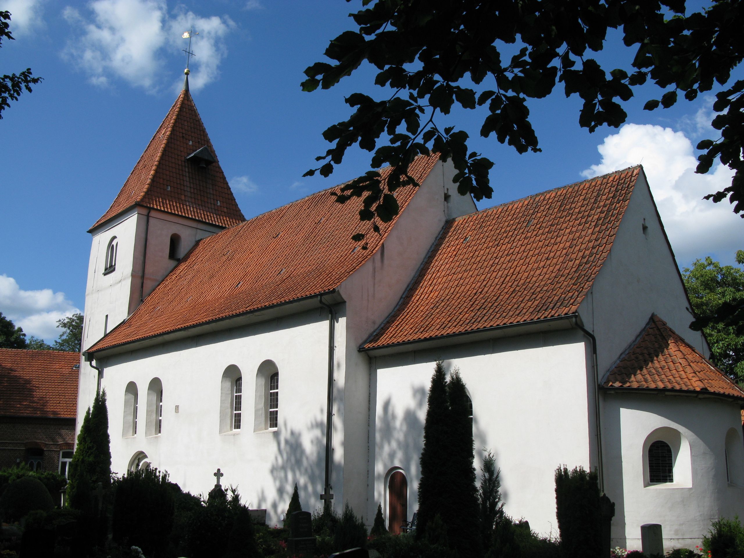 Eine alte weiße spätromanische Dorfkirche (ca. um 1190) mit Pfarrhaus auf einer Warft in schöner Wiesenlandschaft. Sie wurde dem „Heiligen Georg im Lande der Gräser“ geweiht.